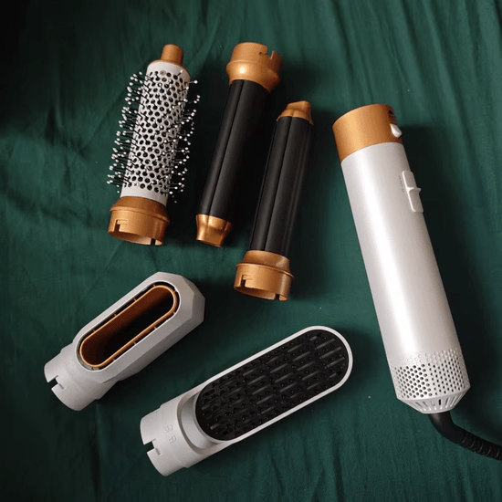 The device includes a smoothing brush, a blow-dry nozzle, two curlers (left/right), and a hair dryer nozzle. Easy to clip on, lightweight, and ultra-manageable, they cover all your needs.